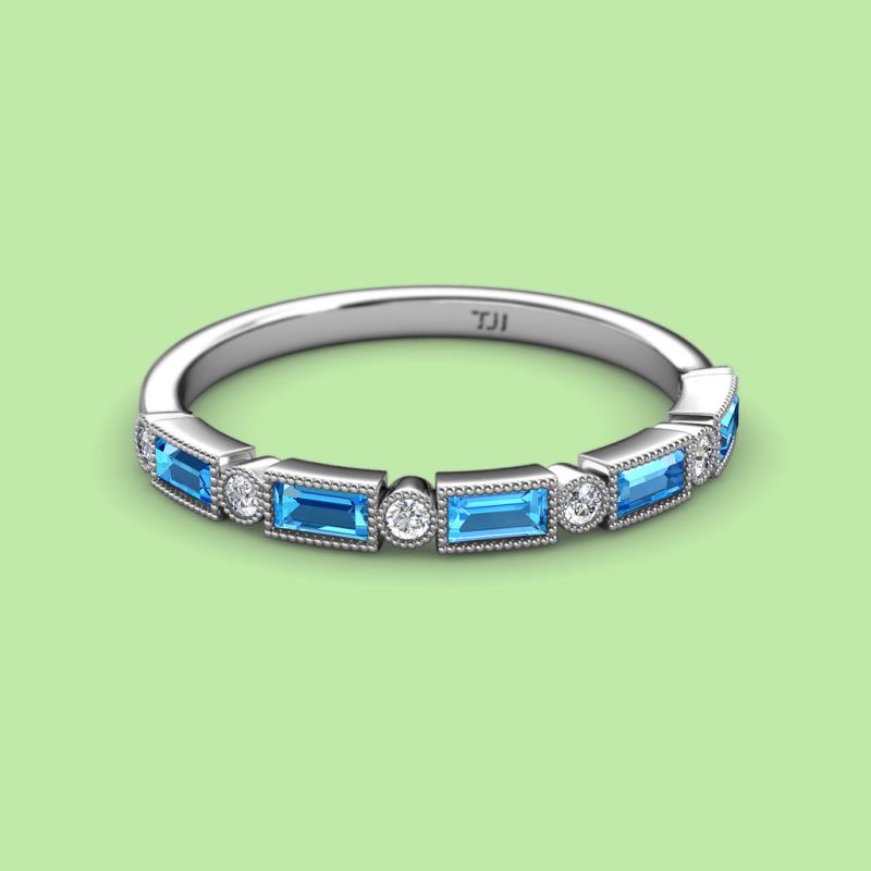 0.82 ctw Baguette Shape Blue Topaz (4x2 mm) and Round Lab Grown Diamond Womens Milgrain Wedding Band Stackable in Platinum More Details ...