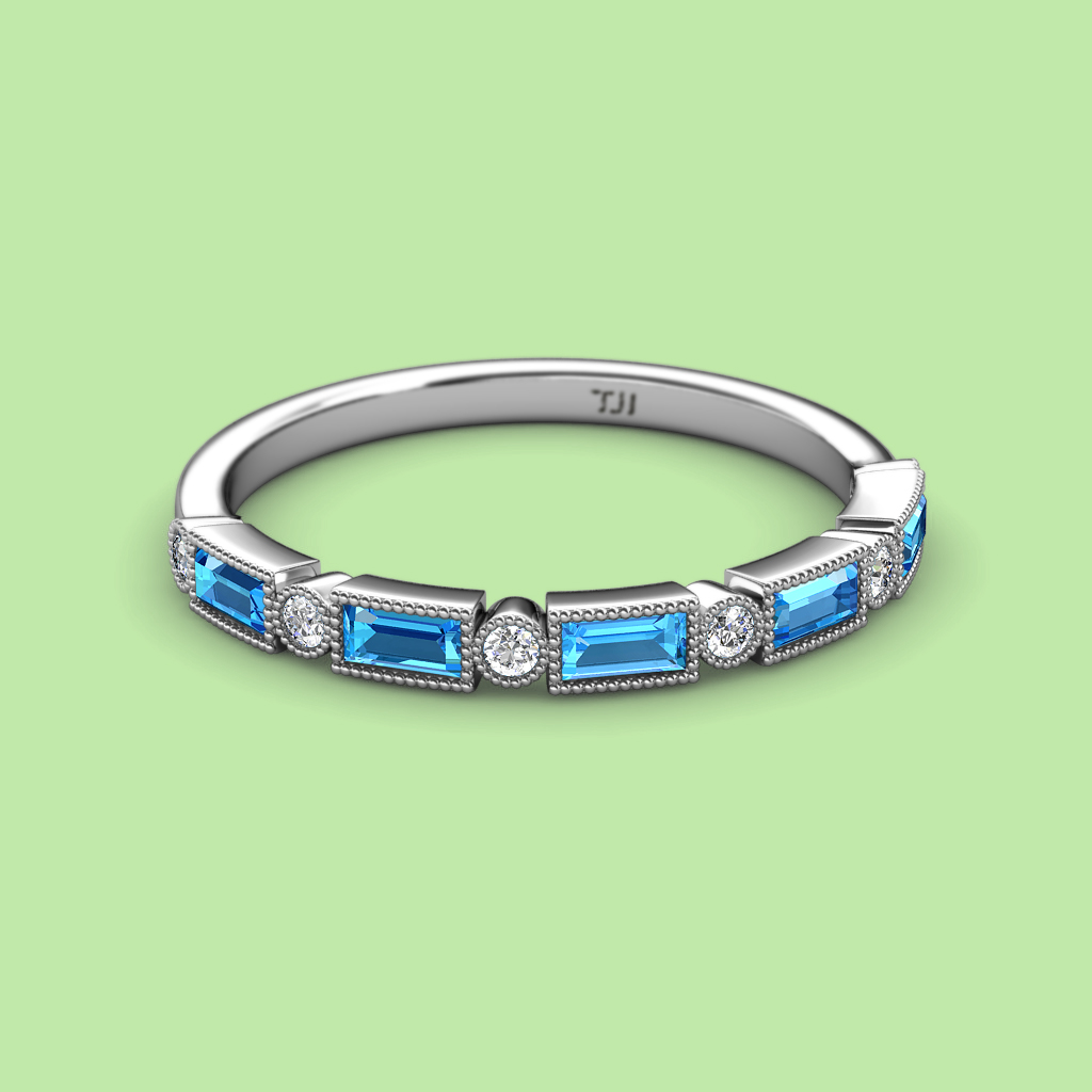 This spectacular Milgrain Wedding Band has Baguette Blue Topaz and Round Diamond that shimmers perfectly together and completes the ensemble on your Wedding Day.