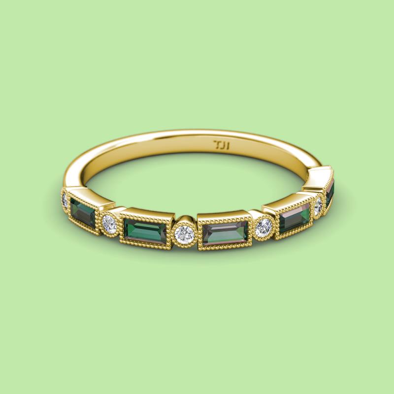 0.87 ctw Baguette Shape Diamond (4x2 mm) and Round Created Alexandrite Women Milgrain Wedding Band Stackable in 14K Yellow Gold More Details ...