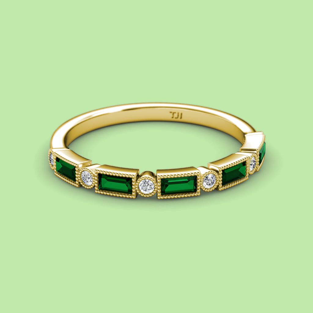 0.62 ctw Baguette Shape Diamond and Round Created Emerald Women Milgrain Wedding Band Stackable in 10K Yellow Gold More Details ...