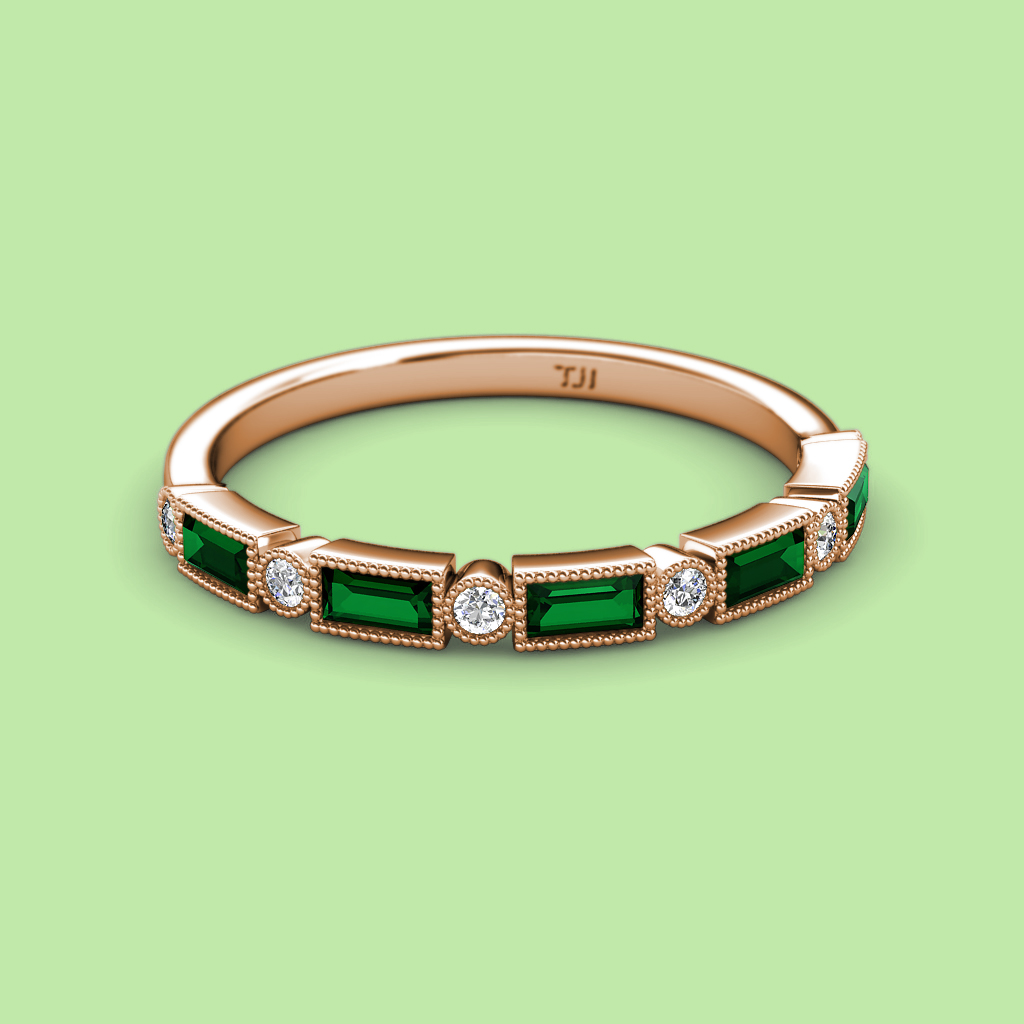 0.62 ctw Baguette Shape Diamond and Round Created Emerald Women Milgrain Wedding Band Stackable in 10K Rose Gold More Details ...