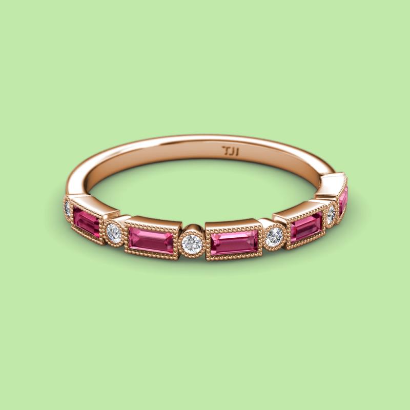 0.82 ctw Baguette Shape Pink Tourmaline (4x2 mm) and Round Lab Grown Diamond Womens Milgrain Wedding Band Stackable in 18K Rose Gold More Details ...