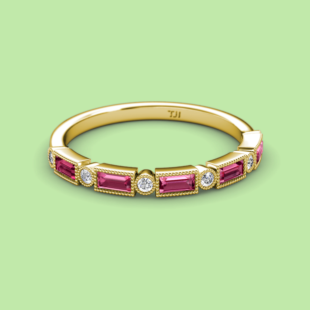 0.82 ctw Baguette Shape Diamond and Round Pink Tourmaline Women Milgrain Wedding Band Stackable in 18K Yellow Gold More Details ...