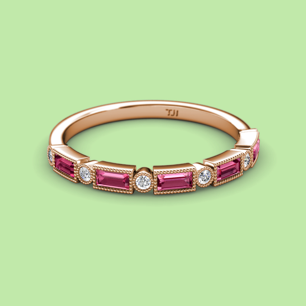 0.82 ctw Baguette Shape Diamond and Round Pink Tourmaline Women Milgrain Wedding Band Stackable in 10K Rose Gold More Details ...