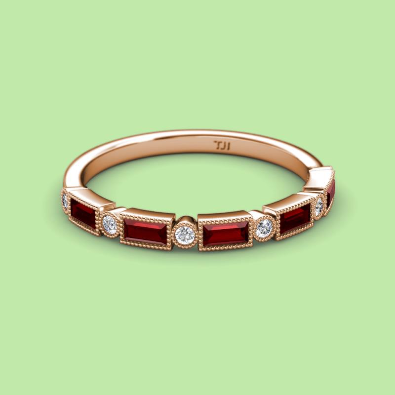 1.02 ctw Baguette Shape Red Garnet (4x2 mm) and Round Lab Grown Diamond Womens Milgrain Wedding Band Stackable in 18K Rose Gold More Details ...