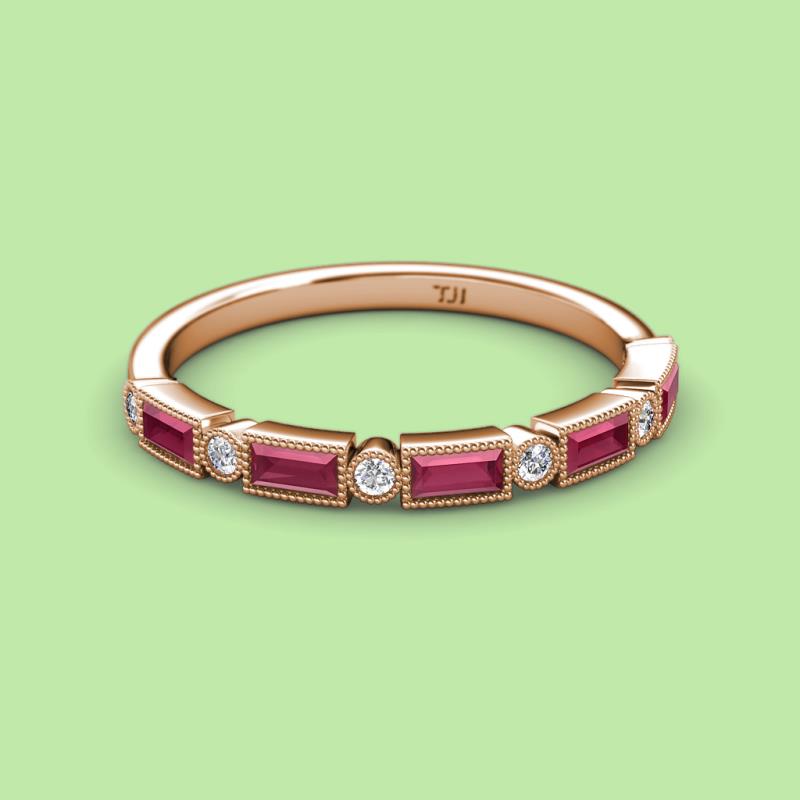 0.92 ctw Baguette Shape Rhodolite Garnet (4x2 mm) and Round Lab Grown Diamond Womens Milgrain Wedding Band Stackable in 18K Rose Gold More Details ...