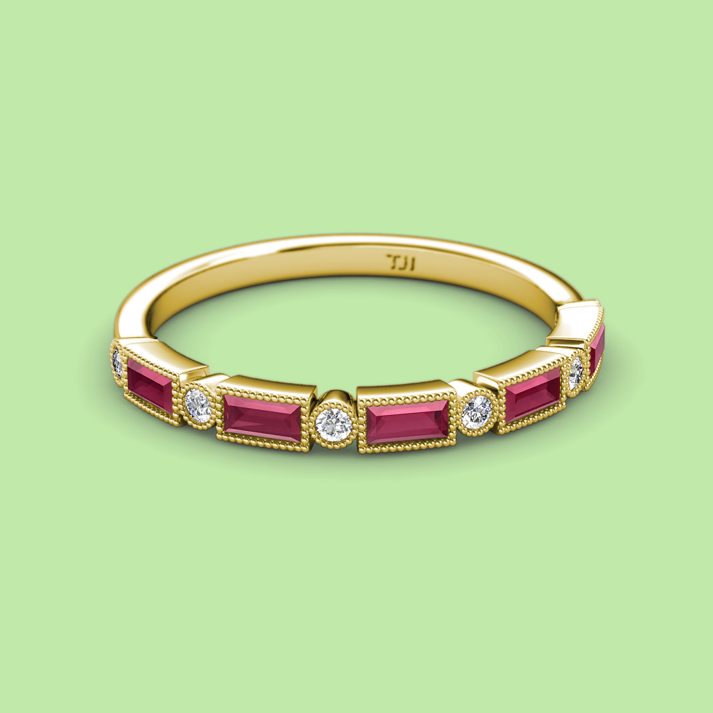0.92 ctw Baguette Shape Diamond and Round Rhodolite Garnet Women Milgrain Wedding Band Stackable in 10K Yellow Gold More Details ...