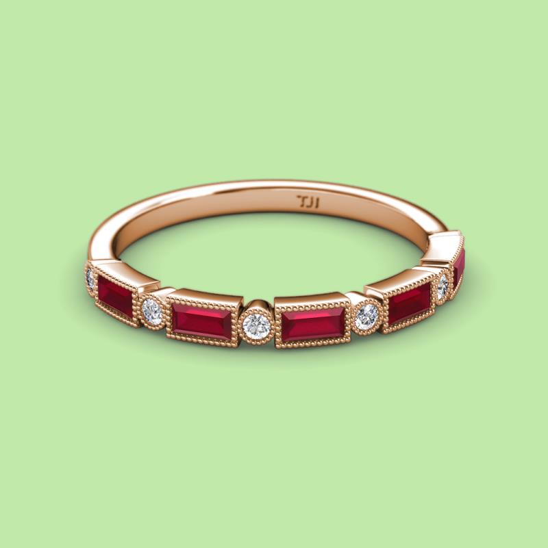0.97 ctw Baguette Shape Diamond (4x2 mm) and Round Ruby Women Milgrain Wedding Band Stackable in 14K Rose Gold More Details ...