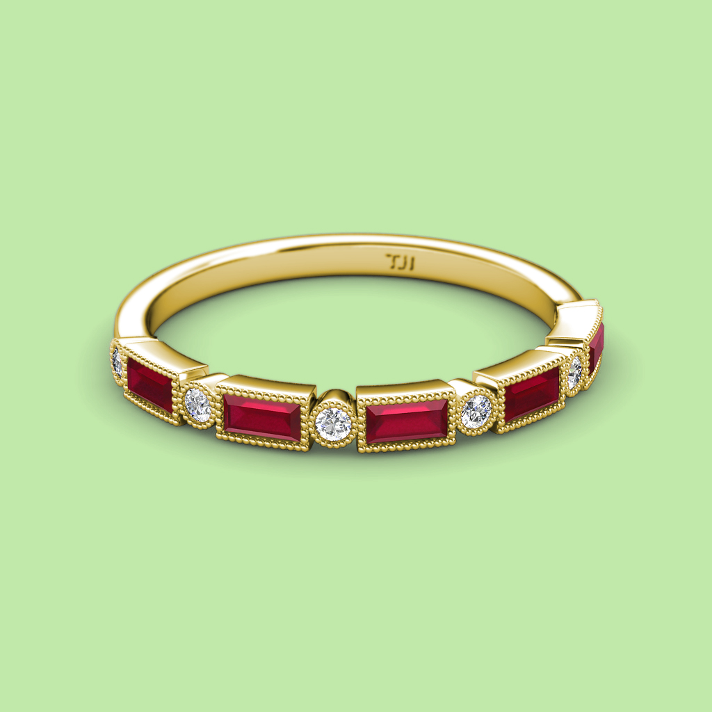 0.97 ctw Baguette Shape Diamond and Round Ruby Women Milgrain Wedding Band Stackable in 10K Yellow Gold More Details ...