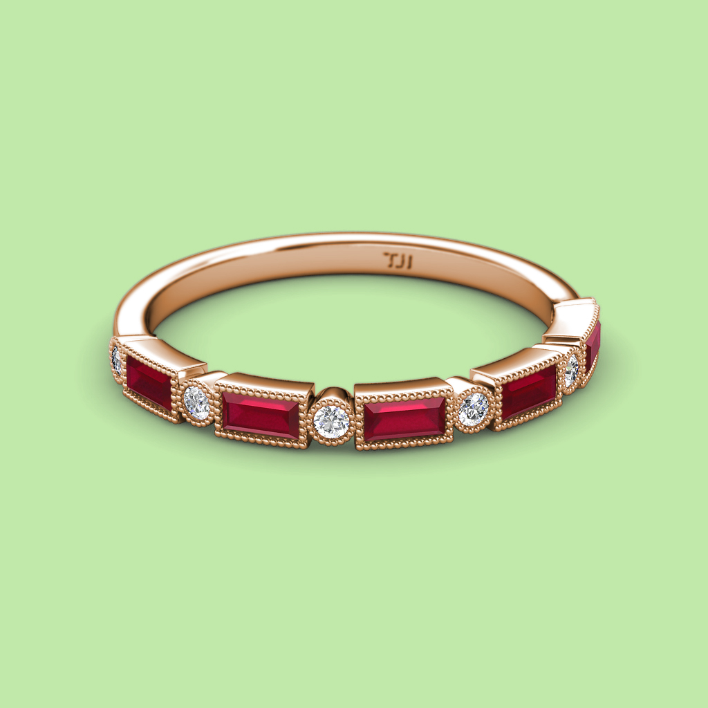 0.97 ctw Baguette Shape Diamond and Round Ruby Women Milgrain Wedding Band Stackable in 10K Rose Gold More Details ...