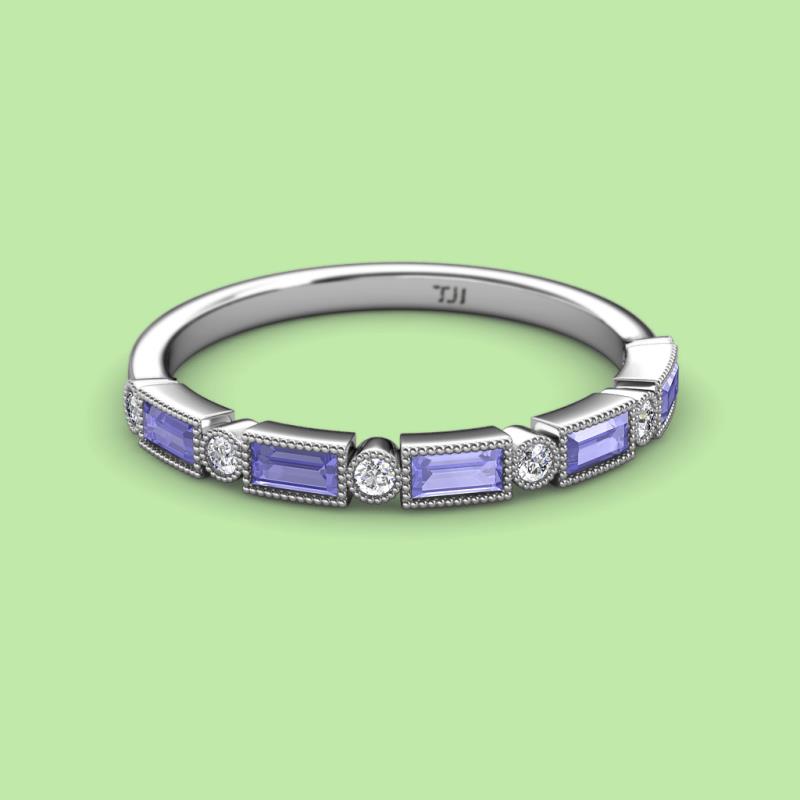 This spectacular Milgrain Wedding Band has Baguette Tanzanite and Round Lab Grown Diamond that shimmers perfectly together and completes the ensemble on your Wedding Day.
