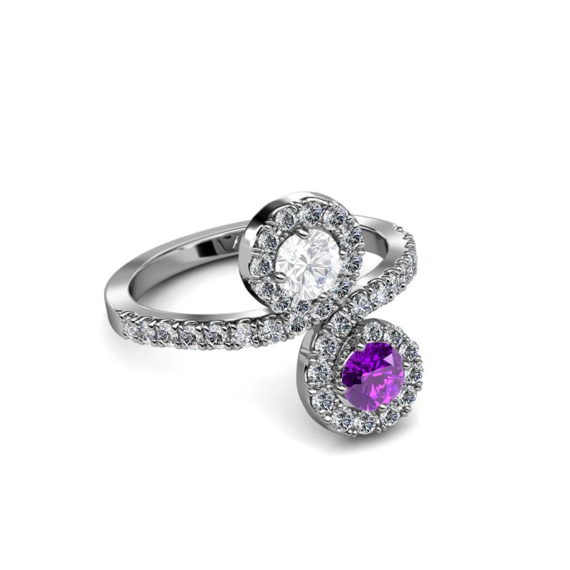 A divine symbol of togetherness, where one stone represents love and one friendship while each end of the ring swirls around the marvelous combination of Amethyst & White Sapphire meeting above and below, rather than in the center.