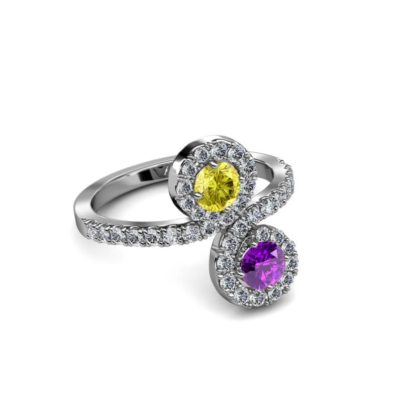 A divine symbol of togetherness, where one stone represents love and one friendship while each end of the ring swirls around the marvelous combination of Amethyst & Yellow Diamond meeting above and below, rather than in the center.