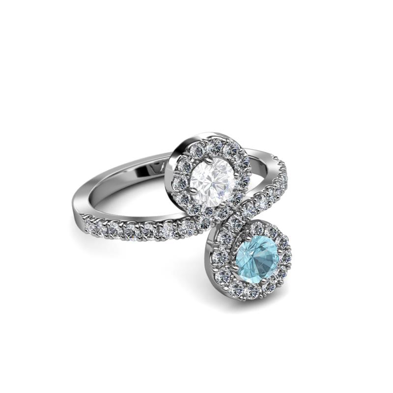 A divine symbol of togetherness, where one stone represents love and one friendship while each end of the ring swirls around the marvelous combination of Aquamarine & White Sapphire meeting above and below, rather than in the center.