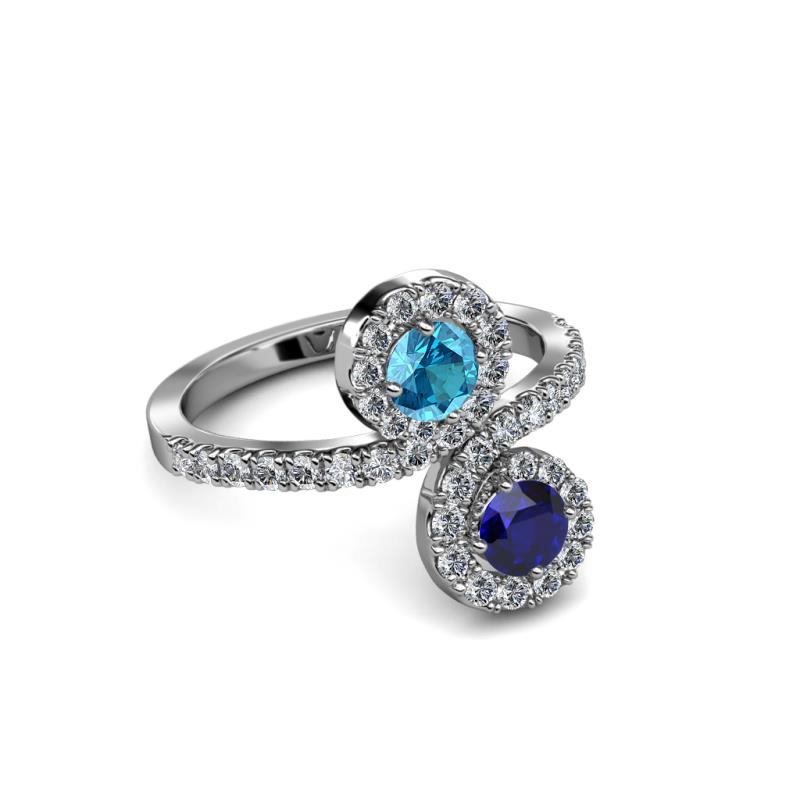A divine symbol of togetherness, where one stone represents love and one friendship while each end of the ring swirls around the marvelous combination of Blue Sapphire & London Blue Topaz meeting above and below, rather than in the center.