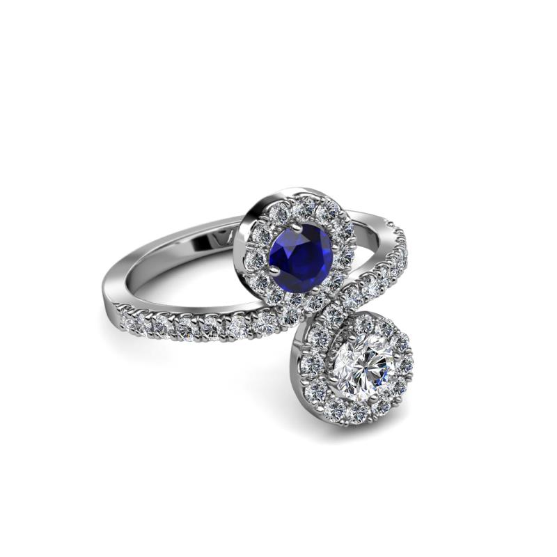 A divine symbol of togetherness, where one stone represents love and one friendship while each end of the ring swirls around the marvelous combination of Diamond & Blue Sapphire meeting above and below, rather than in the center.