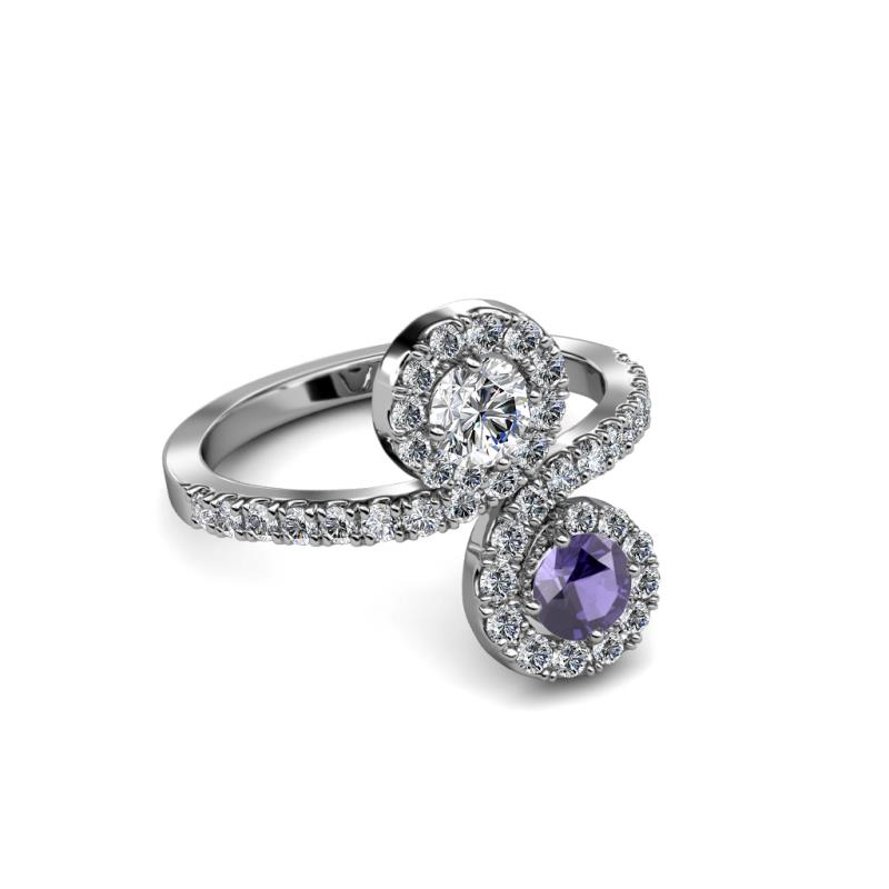 A divine symbol of togetherness, where one stone represents love and one friendship while each end of the ring swirls around the marvelous combination of Iolite & Diamond meeting above and below, rather than in the center.