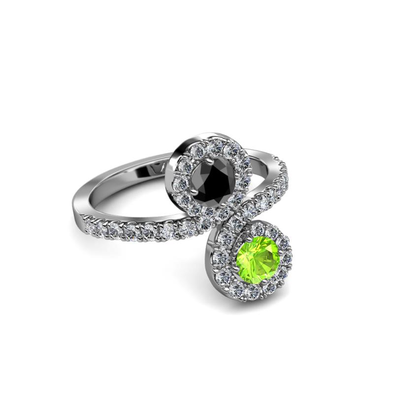 A divine symbol of togetherness, where one stone represents love and one friendship while each end of the ring swirls around the marvelous combination of Peridot & Black Diamond meeting above and below, rather than in the center.