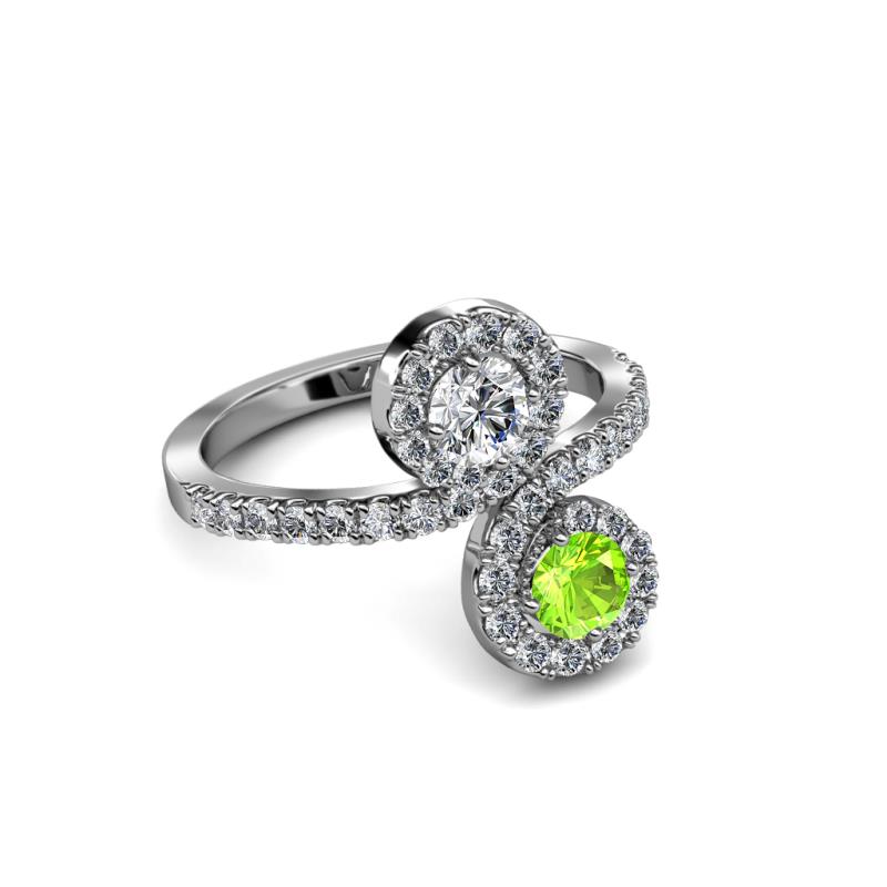 A divine symbol of togetherness, where one stone represents love and one friendship while each end of the ring swirls around the marvelous combination of Peridot & Diamond meeting above and below, rather than in the center.