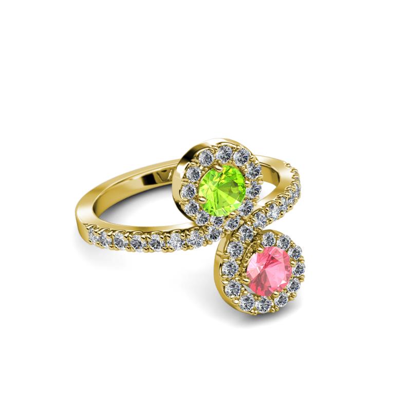 Pink Tourmaline and Peridot 2 Stone with Side Diamonds Womens Bypass Engagement Ring 1.26 ctw 14K Yellow Gold More Details ...