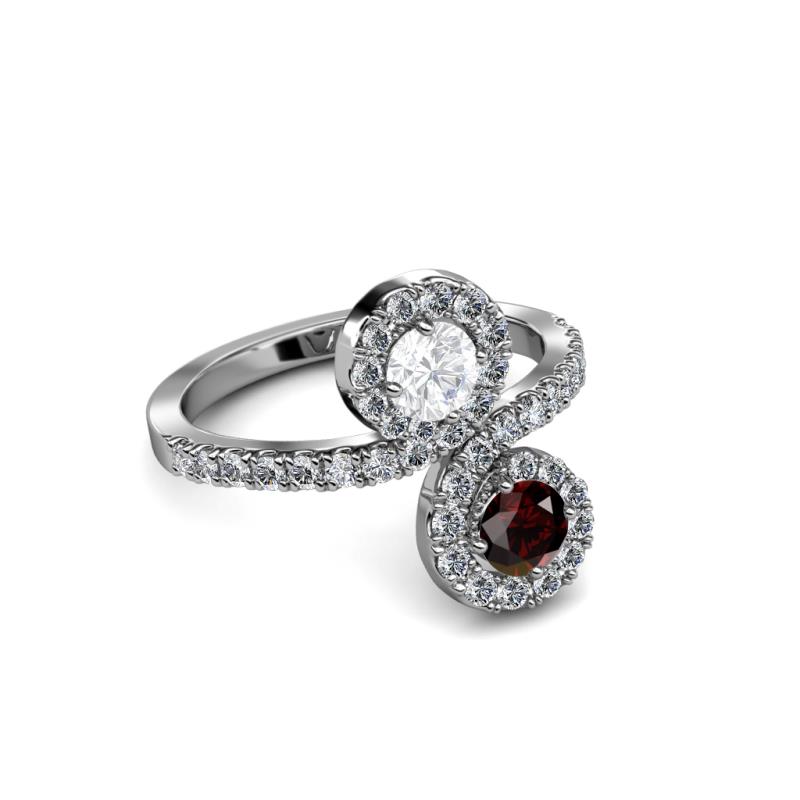 A divine symbol of togetherness, where one stone represents love and one friendship while each end of the ring swirls around the marvelous combination of Red Garnet & White Sapphire meeting above and below, rather than in the center.