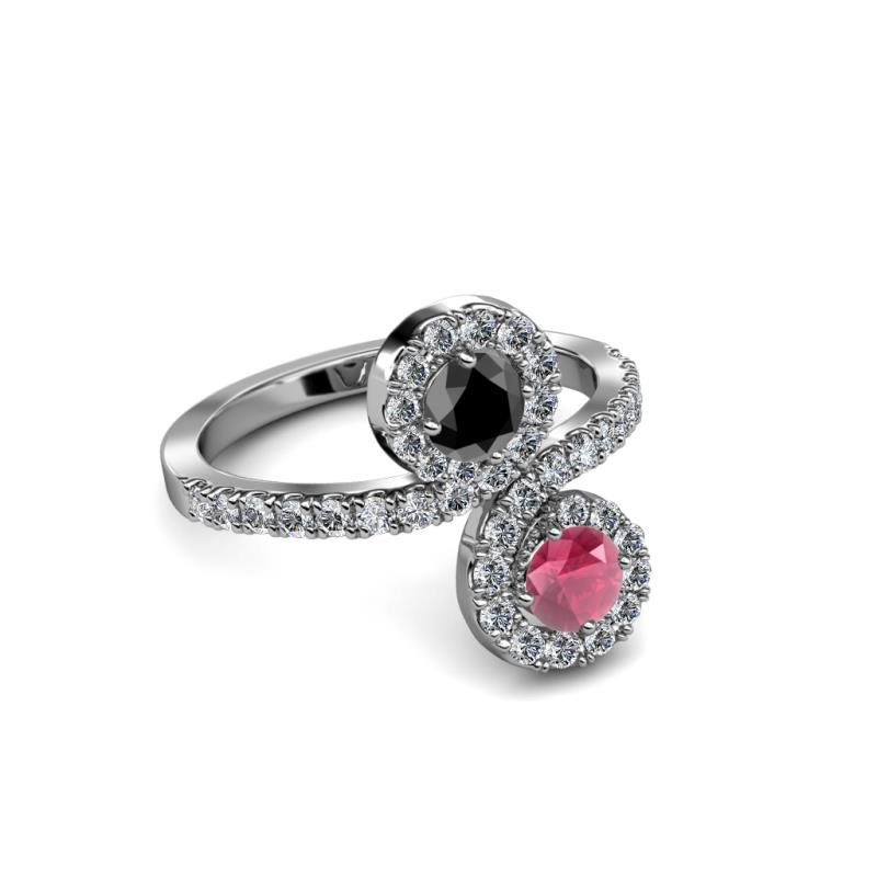 A divine symbol of togetherness, where one stone represents love and one friendship while each end of the ring swirls around the marvelous combination of Rhodolite Garnet & Black Diamond meeting above and below, rather than in the center.
