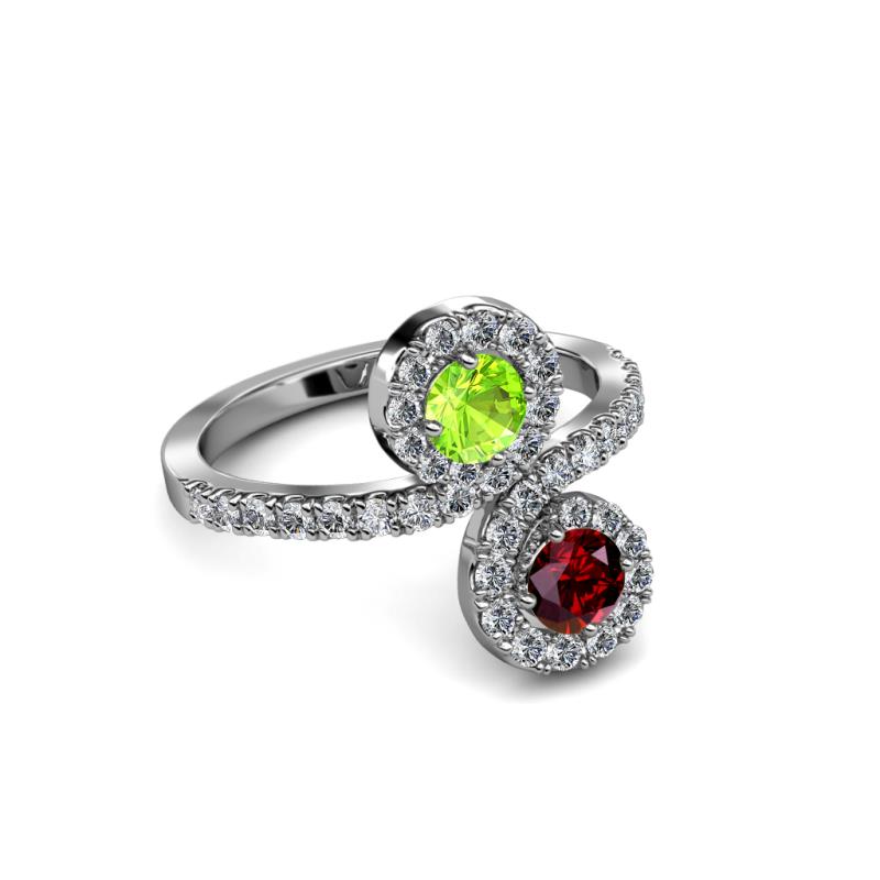 A divine symbol of togetherness, where one stone represents love and one friendship while each end of the ring swirls around the marvelous combination of Ruby & Peridot meeting above and below, rather than in the center.