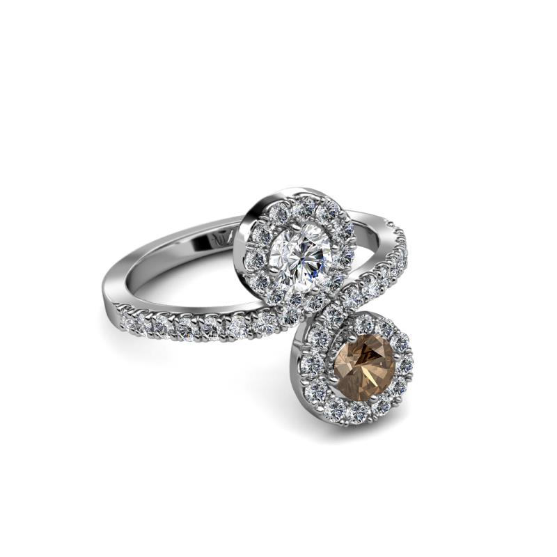 A divine symbol of togetherness, where one stone represents love and one friendship while each end of the ring swirls around the marvelous combination of Smoky Quartz & Diamond meeting above and below, rather than in the center.