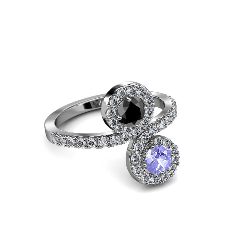 A divine symbol of togetherness, where one stone represents love and one friendship while each end of the ring swirls around the marvelous combination of Tanzanite & Black Diamond meeting above and below, rather than in the center.