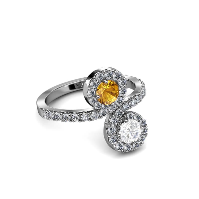 A divine symbol of togetherness, where one stone represents love and one friendship while each end of the ring swirls around the marvelous combination of White Sapphire & Citrine meeting above and below, rather than in the center.