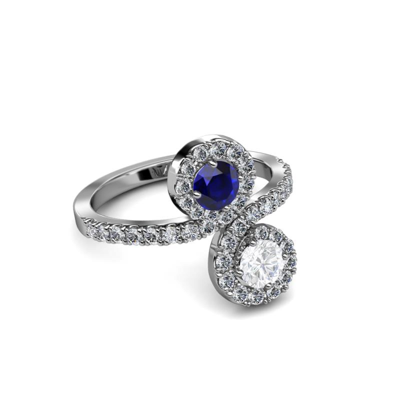 A divine symbol of togetherness, where one stone represents love and one friendship while each end of the ring swirls around the marvelous combination of White Sapphire & Blue Sapphire meeting above and below, rather than in the center.