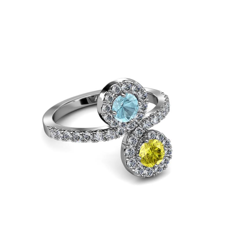 A divine symbol of togetherness, where one stone represents love and one friendship while each end of the ring swirls around the marvelous combination of Yellow Diamond & Aquamarine meeting above and below, rather than in the center.