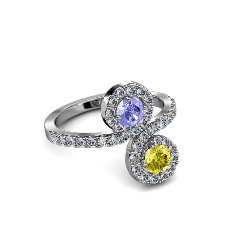 A divine symbol of togetherness, where one stone represents love and one friendship while each end of the ring swirls around the marvelous combination of Yellow Diamond & Tanzanite meeting above and below, rather than in the center.