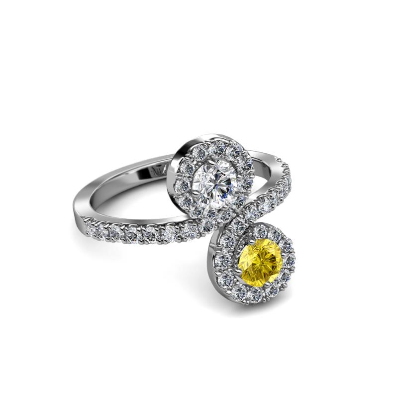 A divine symbol of togetherness, where one stone represents love and one friendship while each end of the ring swirls around the marvelous combination of Yellow Sapphire & Diamond meeting above and below, rather than in the center.