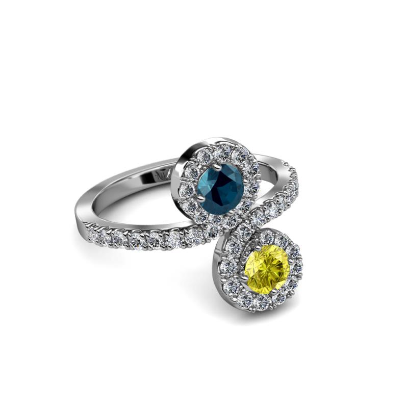 A divine symbol of togetherness, where one stone represents love and one friendship while each end of the ring swirls around the marvelous combination of Yellow Diamond & Blue Diamond meeting above and below, rather than in the center.