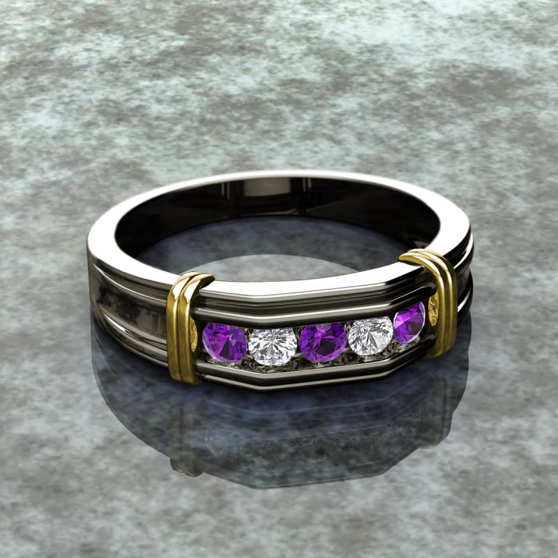 0.44 ctw Round 5 Amethyst and Natural Diamond (3 mm) using Channel setting Men Wedding Band in 18K Gold. More Details ...