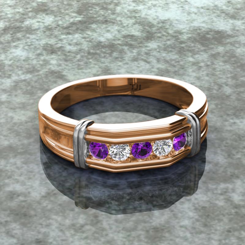 0.44 ctw Round 5 Amethyst and Natural Diamond (3 mm) using Channel setting Men Wedding Band in 10K Rose Gold More Details ...
