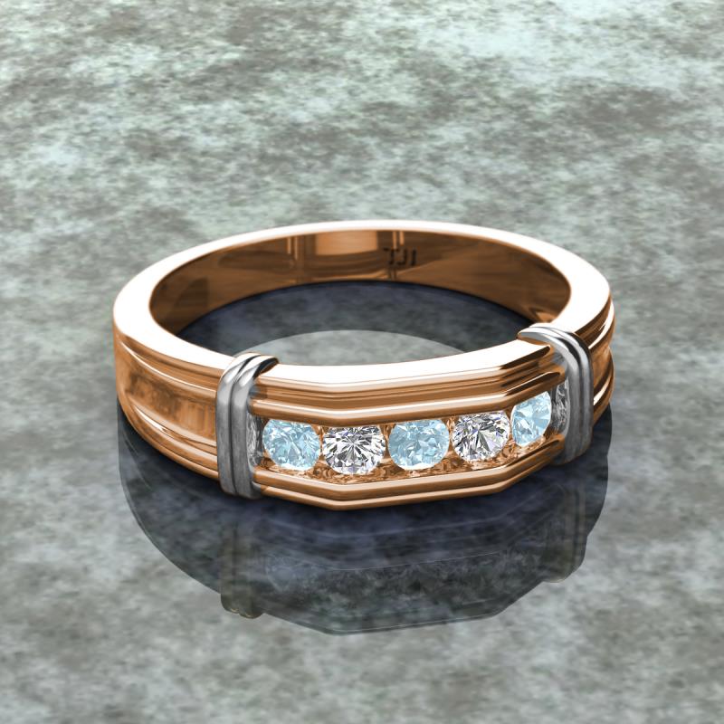 0.44 ctw Round 5 Aquamarine and Natural Diamond (3 mm) using Channel setting Men Wedding Band in 10K Rose Gold More Details ...