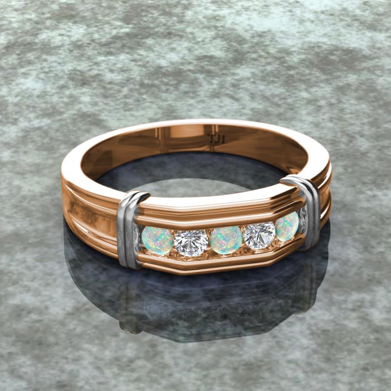 0.38 ctw Round 5 Opal and Natural Diamond (3 mm) using Channel setting Men Wedding Band in 18K Rose Gold More Details ...
