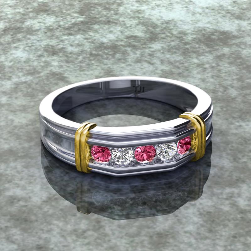 0.44 ctw Round 5 Pink Tourmaline and Natural Diamond (3 mm) using Channel setting Men Wedding Band in 18K White Gold More Details ...