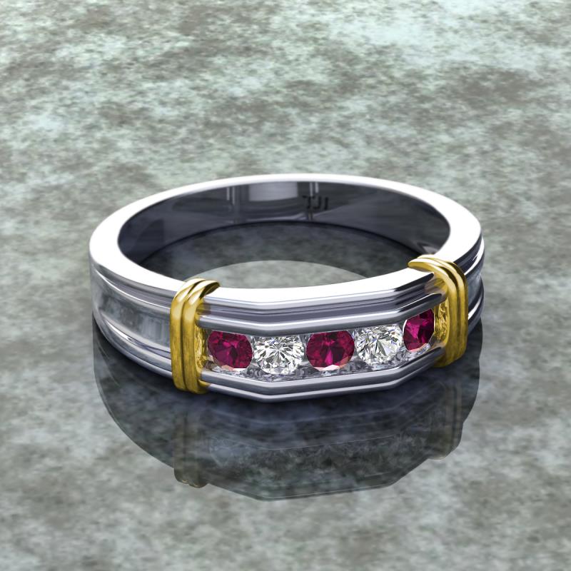 0.55 ctw Round 5 Rhodolite Garnet and Natural Diamond (3 mm) using Channel setting Men Wedding Band in 14K White Gold More Details ...