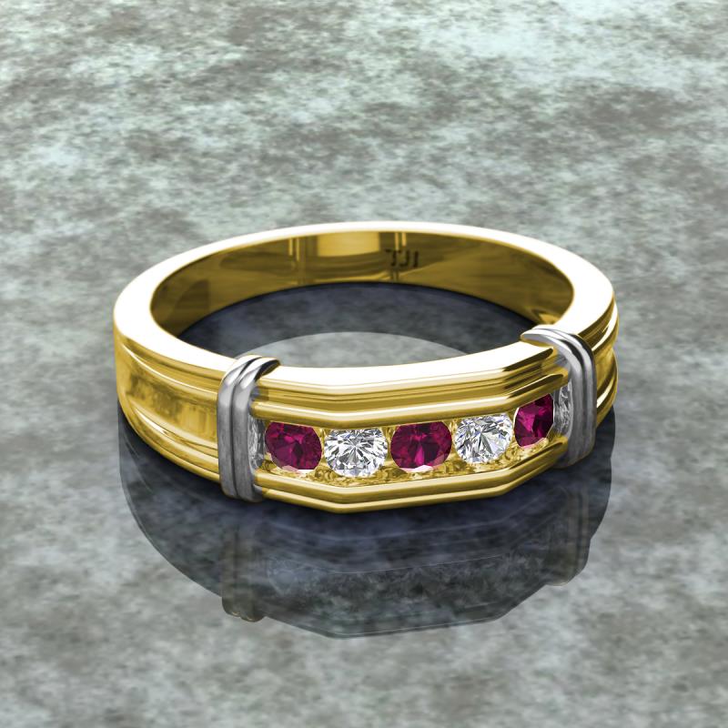 0.55 ctw Round 5 Rhodolite Garnet and Natural Diamond (3 mm) using Channel setting Men Wedding Band in 14K Yellow Gold More Details ...
