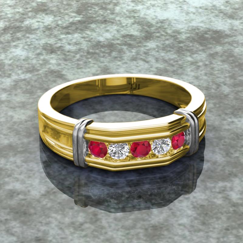 0.50 ctw Round 5 Ruby and Natural Diamond (3 mm) using Channel setting Men Wedding Band in 18K Yellow Gold More Details ...
