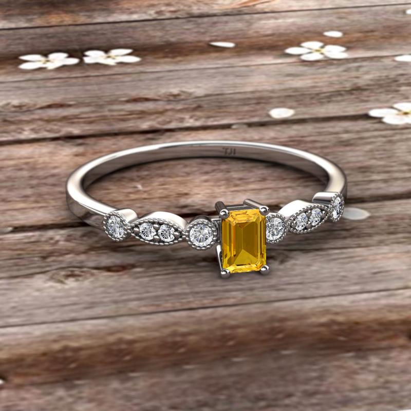 Emerald Cut (6x4 mm) Citrine and Round Diamond 3/4 ctw Marquise and Dot Womens Engagement Ring 18K White Gold More Details ...