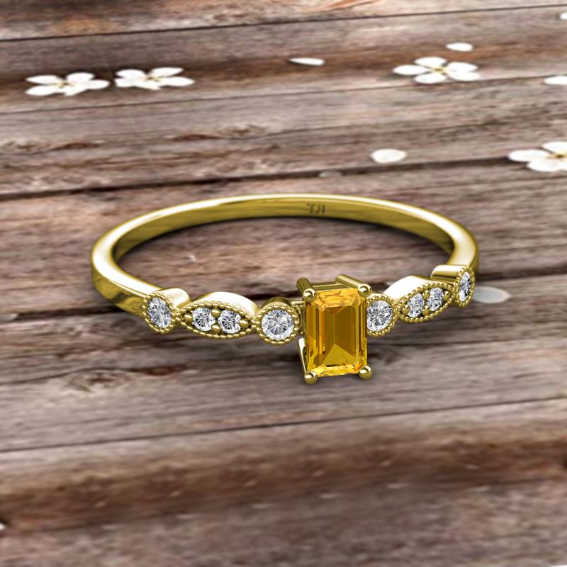This Contemporary Engagement Ring Embodies Emerald Cut Citrine with Marquise and Dot Diamond accents on the shank that showcases luxury and is sure to Impress.