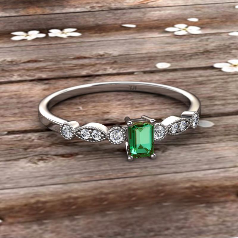 This Contemporary Engagement Ring Embodies Emerald Cut Lab Created Alexandrite with Marquise and Dot Diamond accents on the shank that showcases luxury and is sure to Impress.