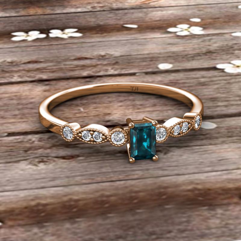 This Contemporary Engagement Ring Embodies Emerald Cut London Blue Topaz with Marquise and Dot Diamond accents on the shank that showcases luxury and is sure to Impress.