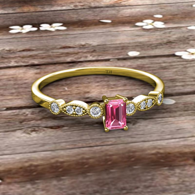 Emerald Cut (6x4 mm) Pink Tourmaline and Round Diamond 3/4 ctw Marquise and Dot Womens Engagement Ring 18K Yellow Gold More Details ...