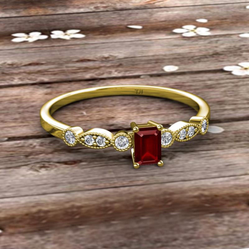 This Contemporary Engagement Ring Embodies Emerald Cut Red Garnet with Marquise and Dot Lab Grown Diamond accents on the shank that showcases luxury and is sure to Impress.