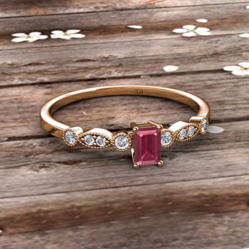 Emerald Cut (6x4 mm) Rhodolite Garnet and Round Diamond 3/4 ctw Marquise and Dot Womens Engagement Ring 18K Rose Gold More Details ...